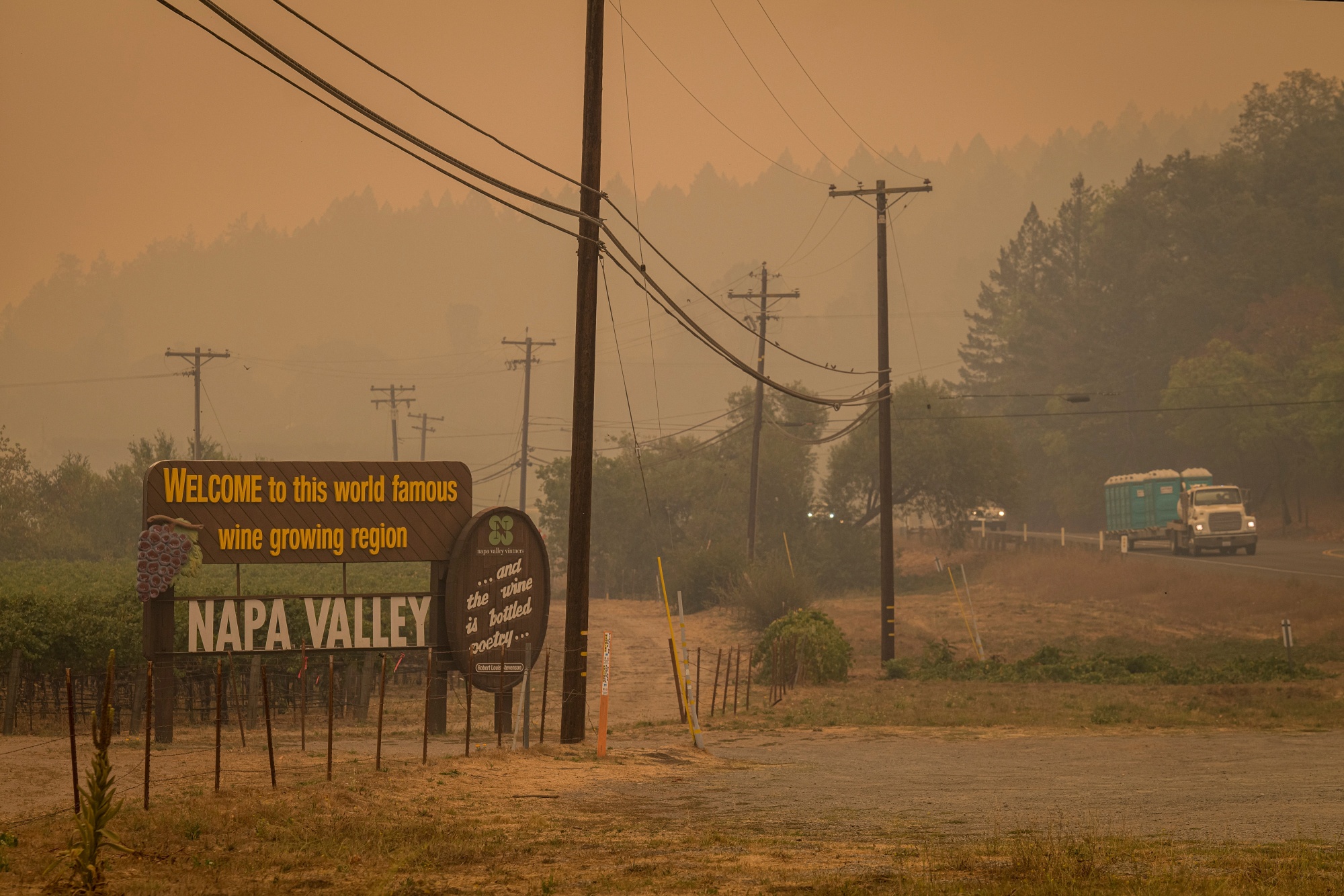 加州圣海伦娜的玻璃火灾造成的烟雾中,纳帕谷的欢迎标志在空中显现,时间是9月28日。摄影师:大卫·保罗·莫里斯/彭博社