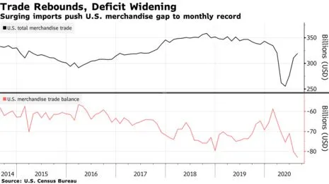 美国的商品贸易逆差在八月份扩大,超出预期,创下新纪录,因为公司在需求增强的情况下急于通过进口补充耗尽的库存。整体逆差从七月份的801亿美元扩大到829亿美元。进口增长了3.1%,达到七个月来的最高点2013亿美元,而出口增长了2.8%,达到1183亿美元。