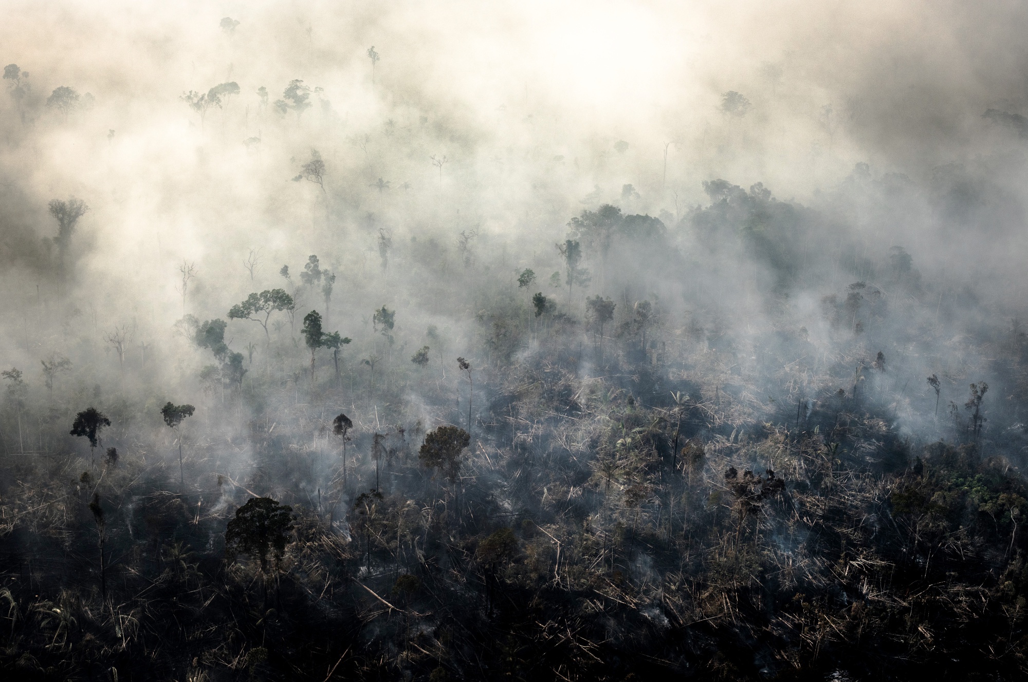 烟雾升起,2019年在巴西朗敦尼亚州波尔图韦柳的坎德亚斯杜贾马里地区,亚马逊雨林中发生火灾。摄影师:莱昂纳多·卡拉托/彭博社