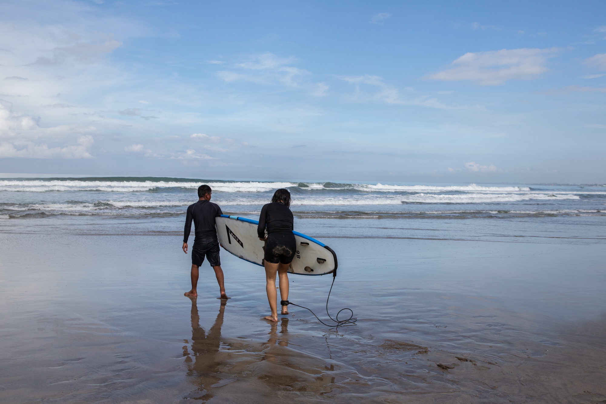人们在印度尼西亚巴厘岛库塔地区的海滩上学习冲浪。