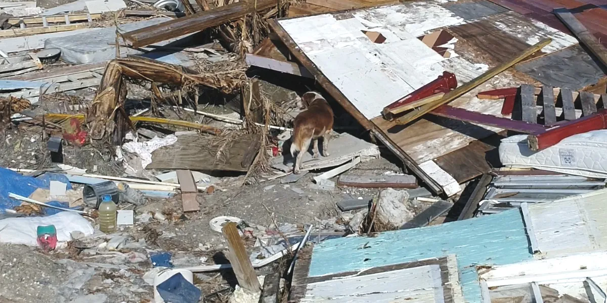 2019年,飓风多里安在巴哈马造成的废墟中留下的一只被困狗。来源:道格拉斯·索恩提供