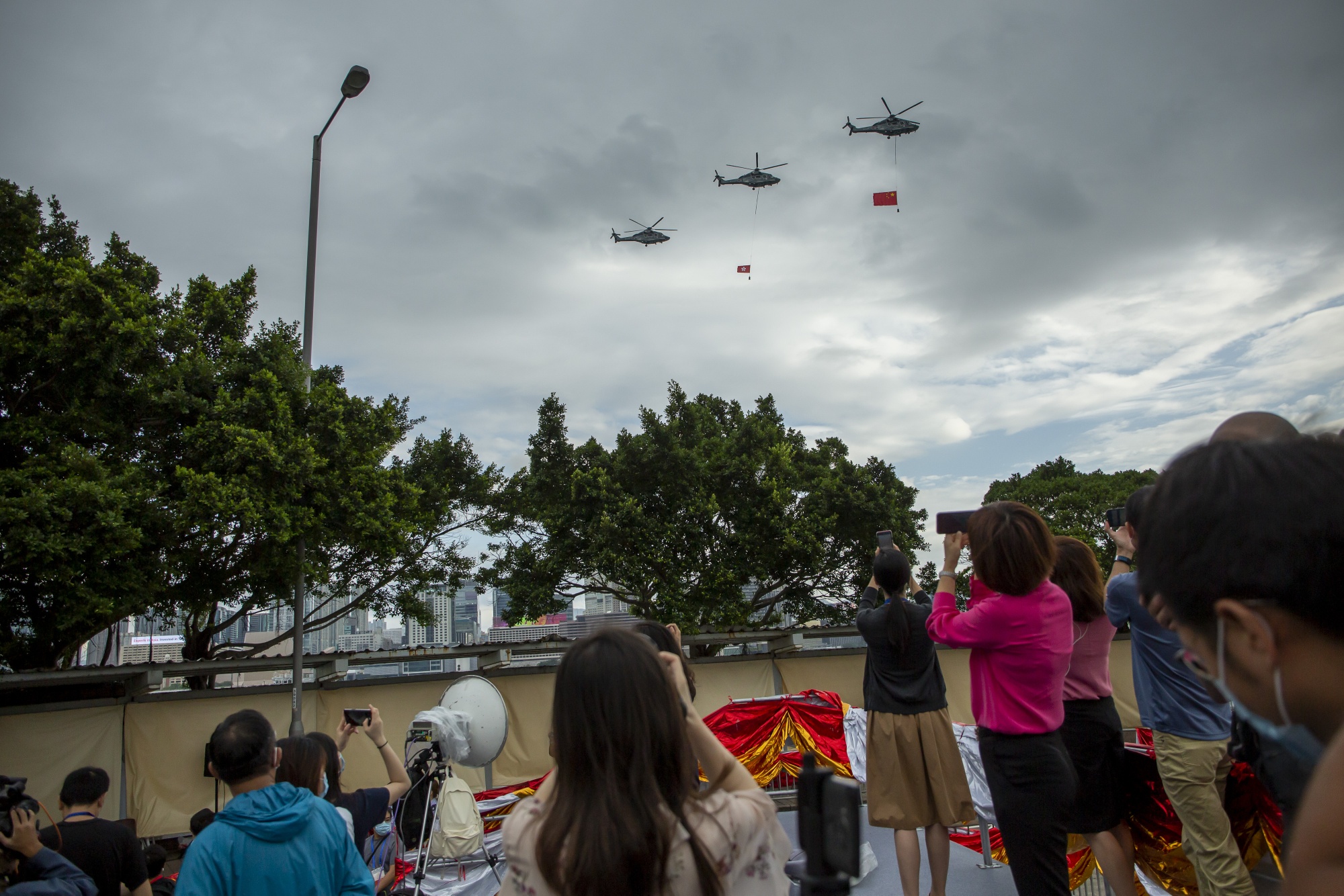 中国和香港特别行政区的国旗在10月1日的香港国庆仪式上由直升机升起。摄影师:保罗·杨/彭博社林郑月娥宣布胜利。