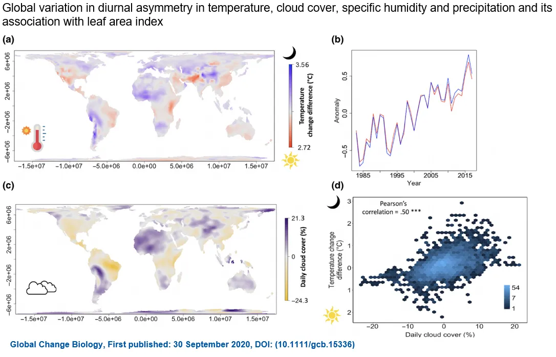 这些是科学家们在《全球变化生物学》期刊上周四发布的结论。全球变化生物学。夜间和白天的升温不对称对植物和野生动物产生影响,可能改变市场中的能源消费方式。