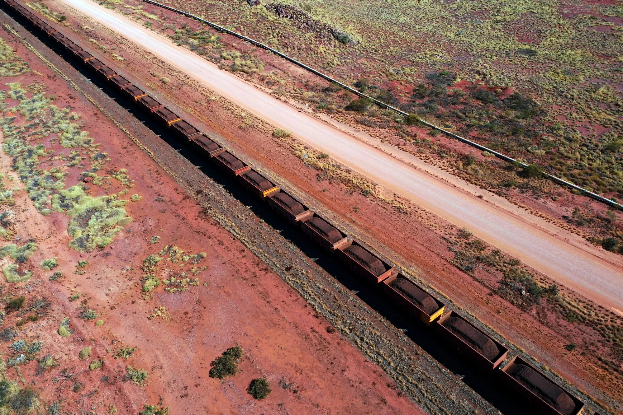 在澳大利亚偏远内陆的赤褐色广袤土地上,蜿蜒的长达一英里的火车运输铁矿石——该国最 有价值的出口——穿越一个日益脆弱于多变天气的关键矿区,那里温度已达到南半球的 纪录 50.7摄氏度(123华氏度)。