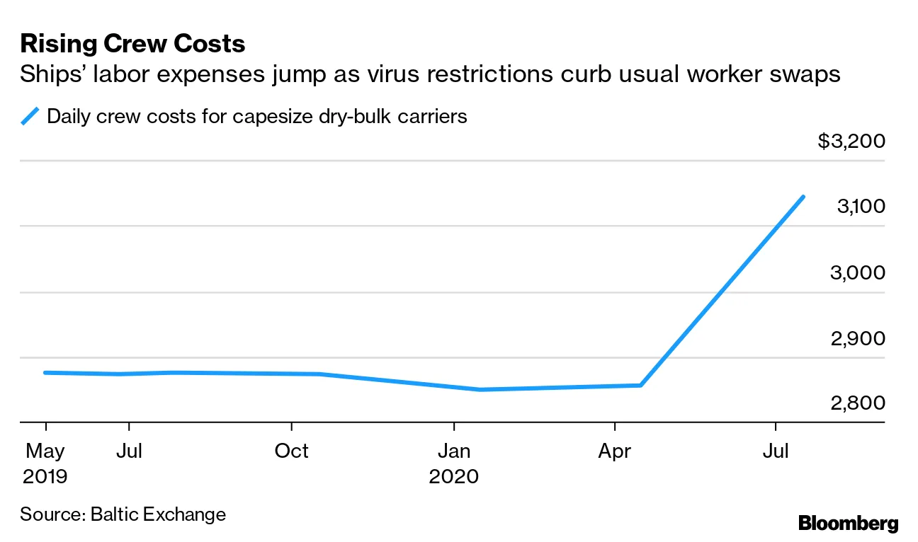 船东面临着 上升的劳动力成本*,因为广泛的与Covid相关的限制限制了海员的流动,使得更换船员的成本更高。由于在疫情期间更换和替换船员变得如此困难,波罗的海交易所(一个追踪基准航运费率的出版商,历史可以追溯到1744年)表示,从1月到7月中旬,日常船员成本增加了10%,对于大型干散货船,成本高达3,144美元。这一数字是自去年5月该交易所开始按季度跟踪数据以来的最高水平。*