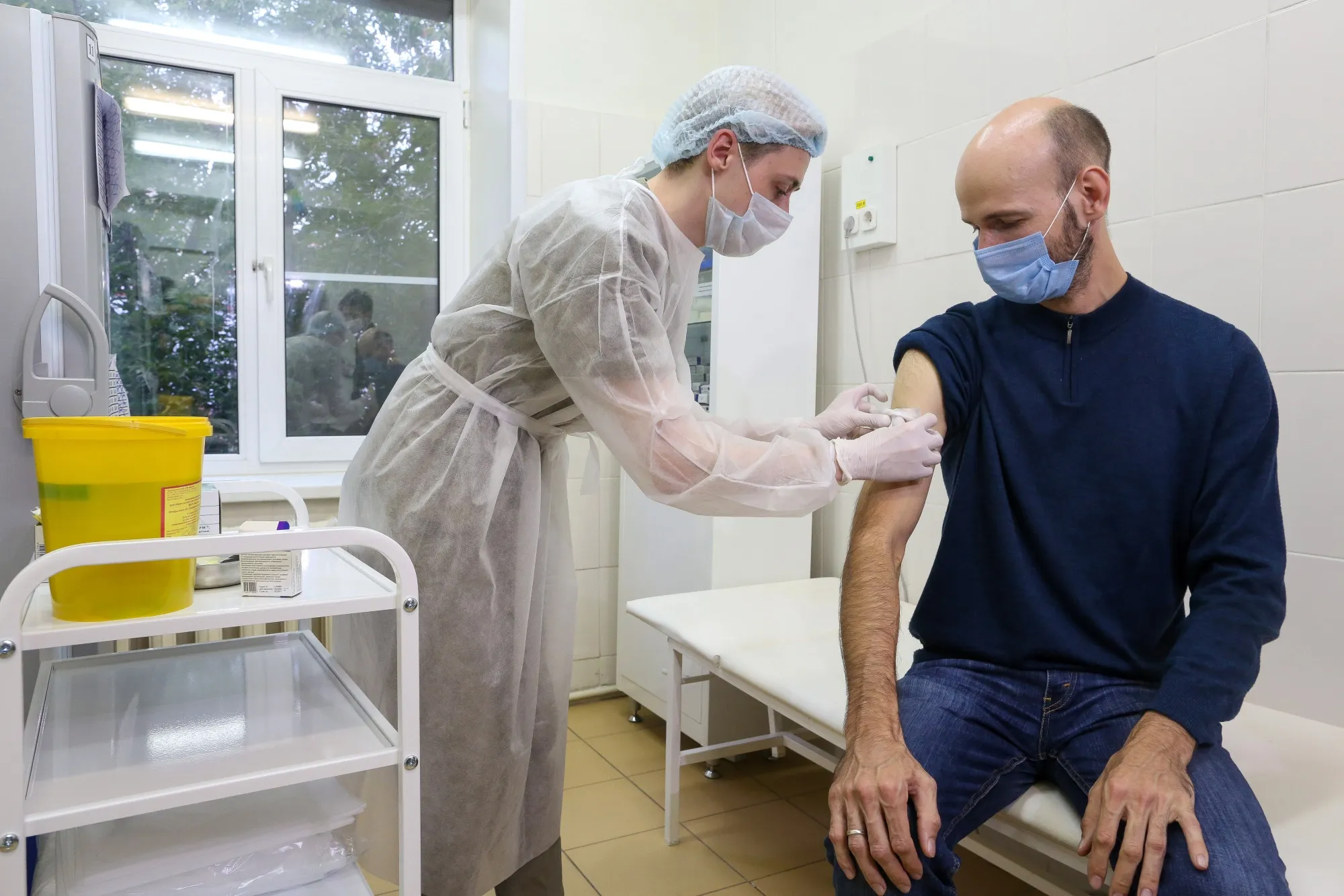 一名卫生工作者在患者的手臂上准备注射部位,以便在9月23日的莫斯科试验中施用Sputnik V疫苗。摄影师:安德烈·鲁达科夫/彭博社随着Covid-19在今年早些时候开始传播,加马列亚的科学家们仅用了几周时间就将他们的MERS腺病毒载体适应于新病原体。在对小鼠、豚鼠和猴子进行测试后,中心的主任和主要科学家们给自己注射了疫苗。