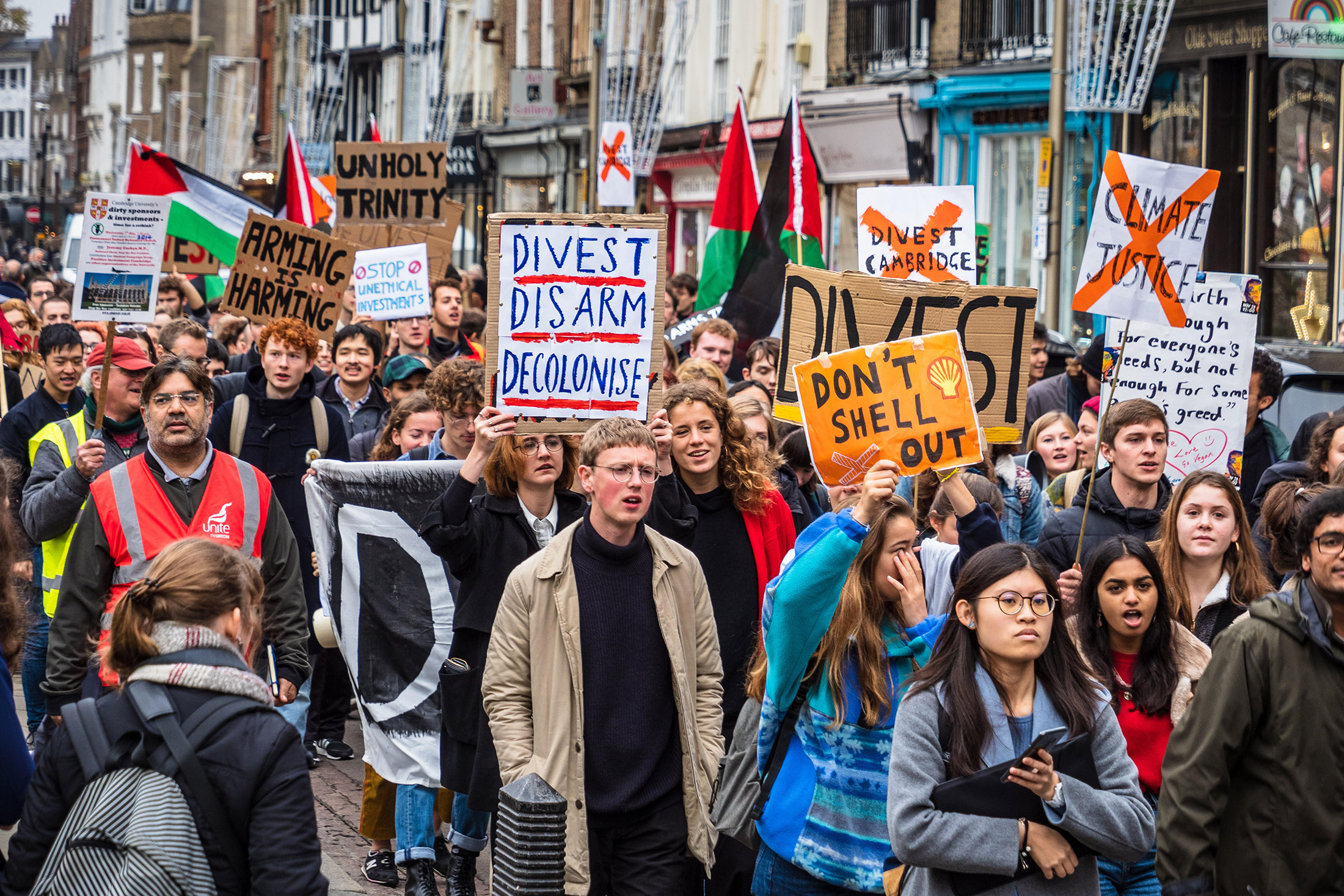 剑桥大学的学生在2018年通过剑桥市中心游行,要求大学撤回其在武器和化石燃料公司的不道德投资。