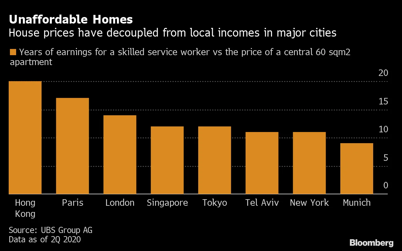 最负担不起的城市——人们需要工作10年或更长时间才能购买一个650平方英尺的公寓——是巴黎、伦敦、新加坡、东京、特拉维夫和纽约。