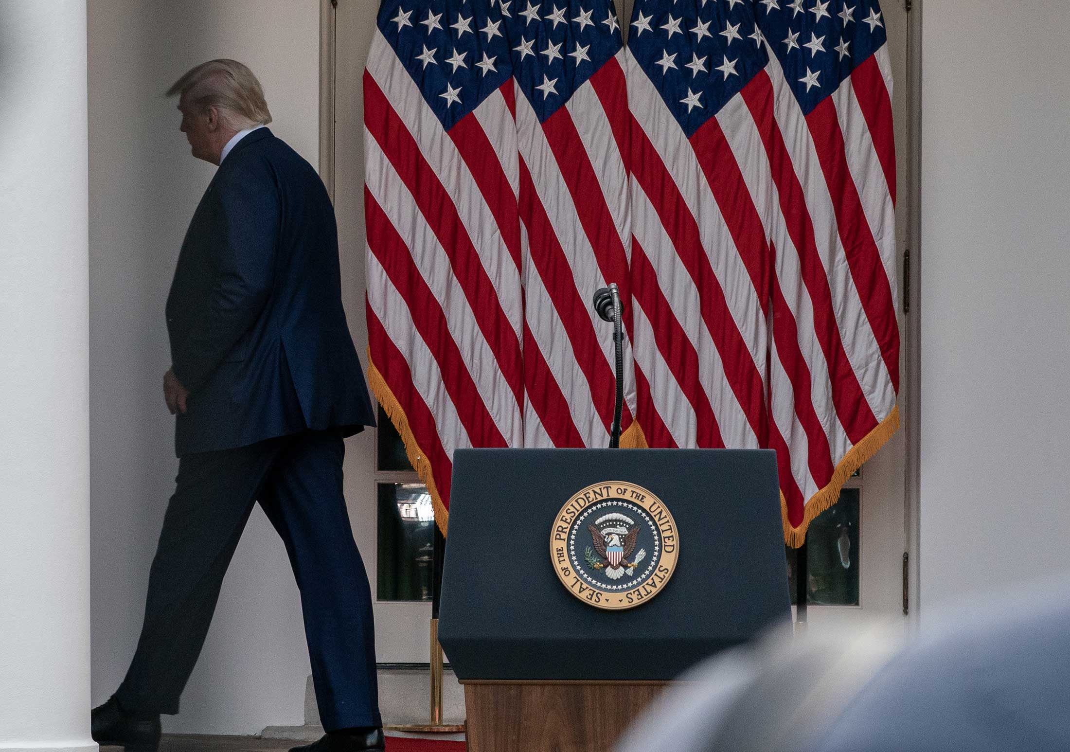 美国总统唐纳德·特朗普在2020年9月28日星期一于华盛顿特区白宫玫瑰园发表讲话后离开。