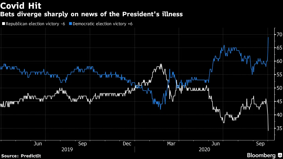 总统唐纳德·特朗普宣布他和第一夫人梅拉尼娅·特朗普新冠病毒检测呈阳性,可能会在一段时间内主导市场。当消息传出时,风险资产如预期般大幅下跌,资金流向美元、日元和国债等避风港。博彩市场迅速反应,显示出11月3日选举中共和党与民主党胜利的赔率初步出现明显分歧。