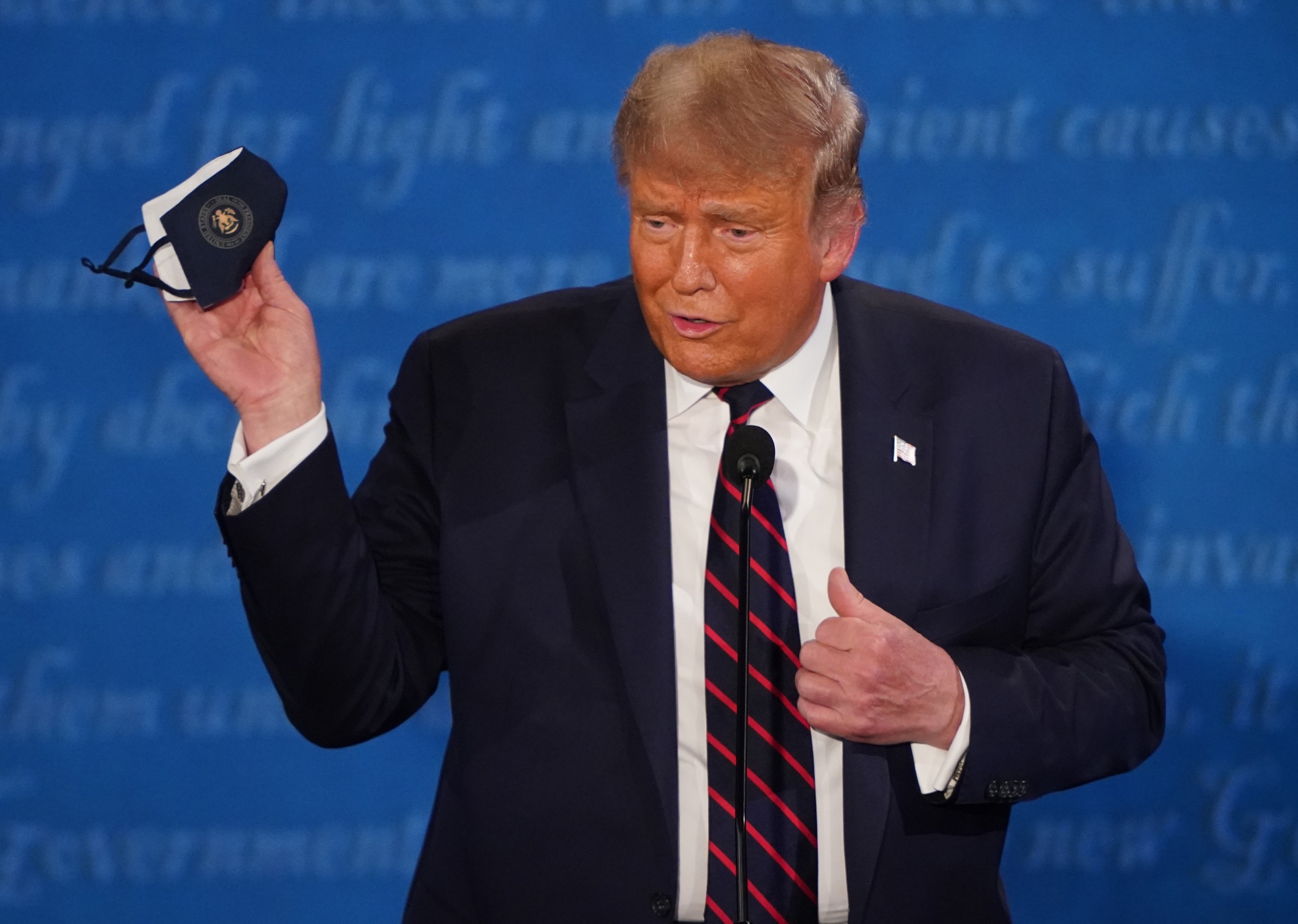 美国总统唐纳德·特朗普在第一次美国总统辩论中拿着一只防护口罩。