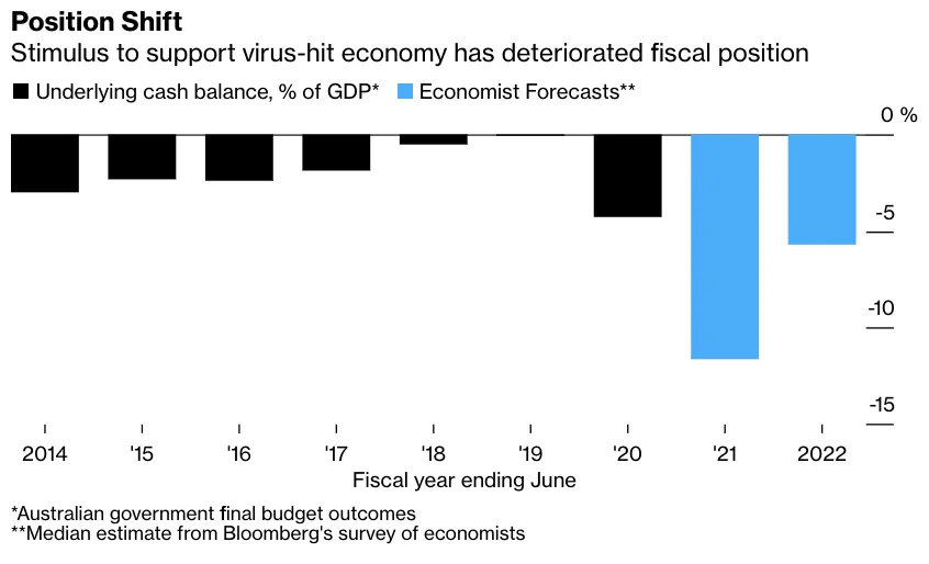 根据彭博社对经济学家的中位数估计,2020-21年的预算赤字预计将扩大至2200亿澳元,占国内生产总值的11.6%。这比财政部7月的预测宽松了355亿澳元,显示出边境关闭——包括国际和国内——以及墨尔本封锁的影响。根据调查,失业率预计将在明年年中上升至8%,而目前为6.8%。