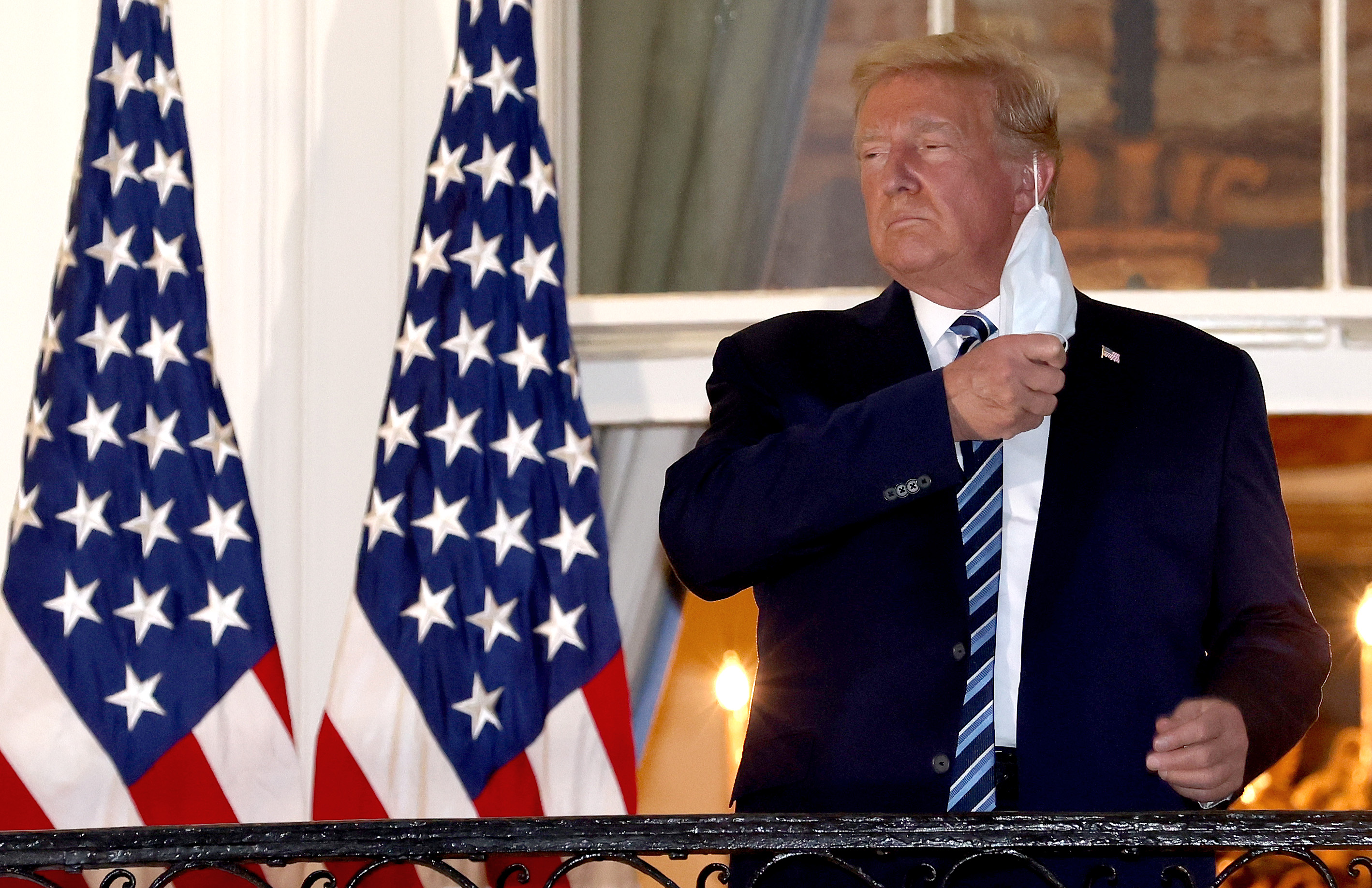 华盛顿,DC - 10月05日:美国总统唐纳德·特朗普在2020年10月05日从沃尔特·里德国家军事医疗中心返回白宫时摘下口罩。特朗普因冠状病毒住院三天。(照片由温·麦克纳米/Getty Images提供)摄影师:温·麦克纳米/Getty Images北美总统唐纳德·特朗普的Covid-19诊断在华盛顿及全球引发震动,提出了关于11月选举、公众对病毒的看法以及国家治理的新问题。