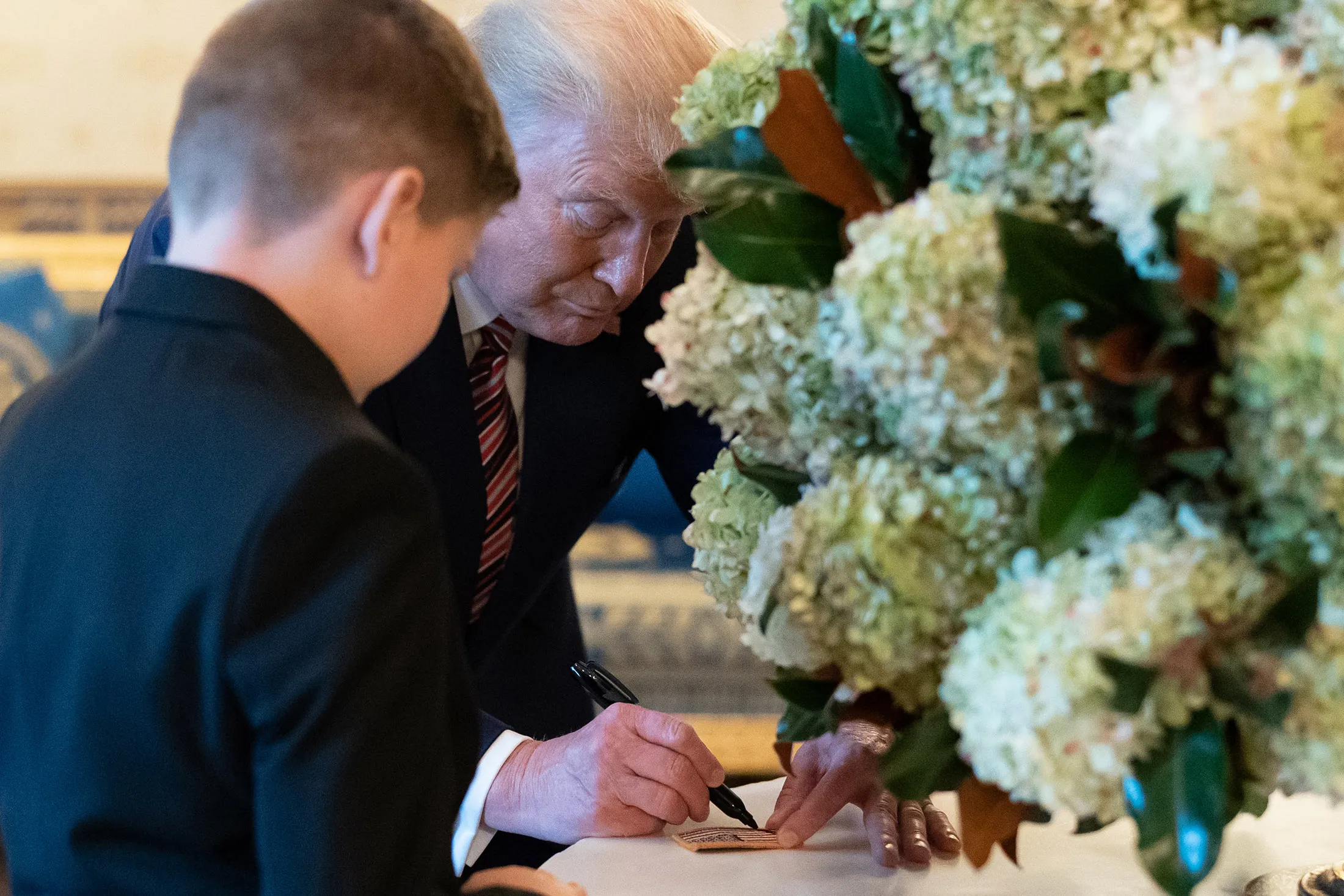 特朗普总统为一位年轻的金星家庭成员签署旗帜补丁。摄影师:安德烈·汉克斯/白宫特朗普在夏尔霍斯的演讲和严肃的仪式中坐在前排,然后与客人交流,并为一个小男孩签名,根据白宫发布的照片。尽管一些工作人员和军事助手戴着口罩,但特朗普和大多数坐着的客人都没有佩戴口罩。