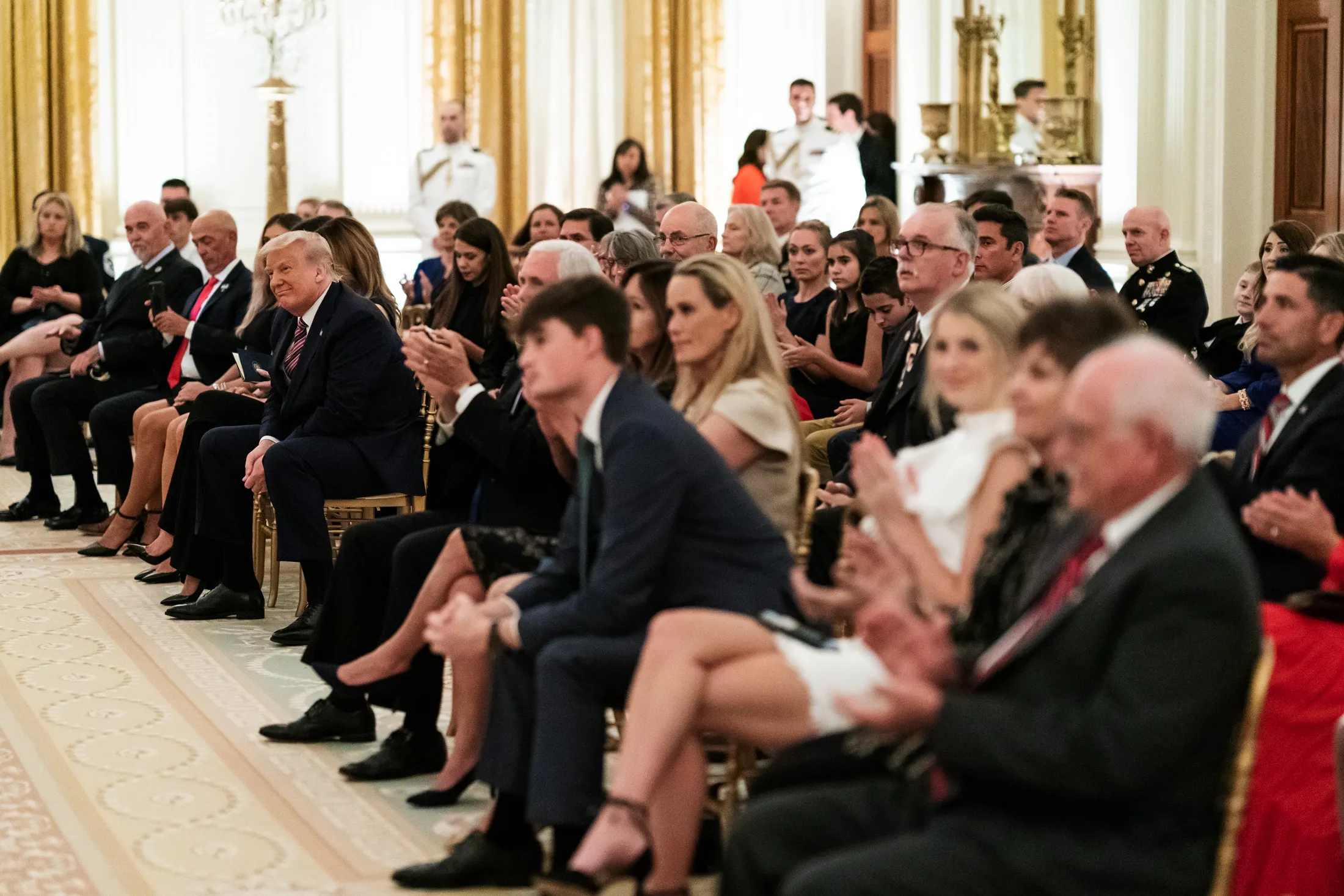 在第一夫人梅拉尼娅·特朗普主持的仪式上,家属们站着,听到他们已故退伍军人的名字被朗读,并点燃蜡烛以示敬意。史蒂文·夏尔霍斯在舞台上握住特朗普的手,然后向他已故的儿子致敬,他是一名在2009年阿富汗被杀的海军陆战队员。