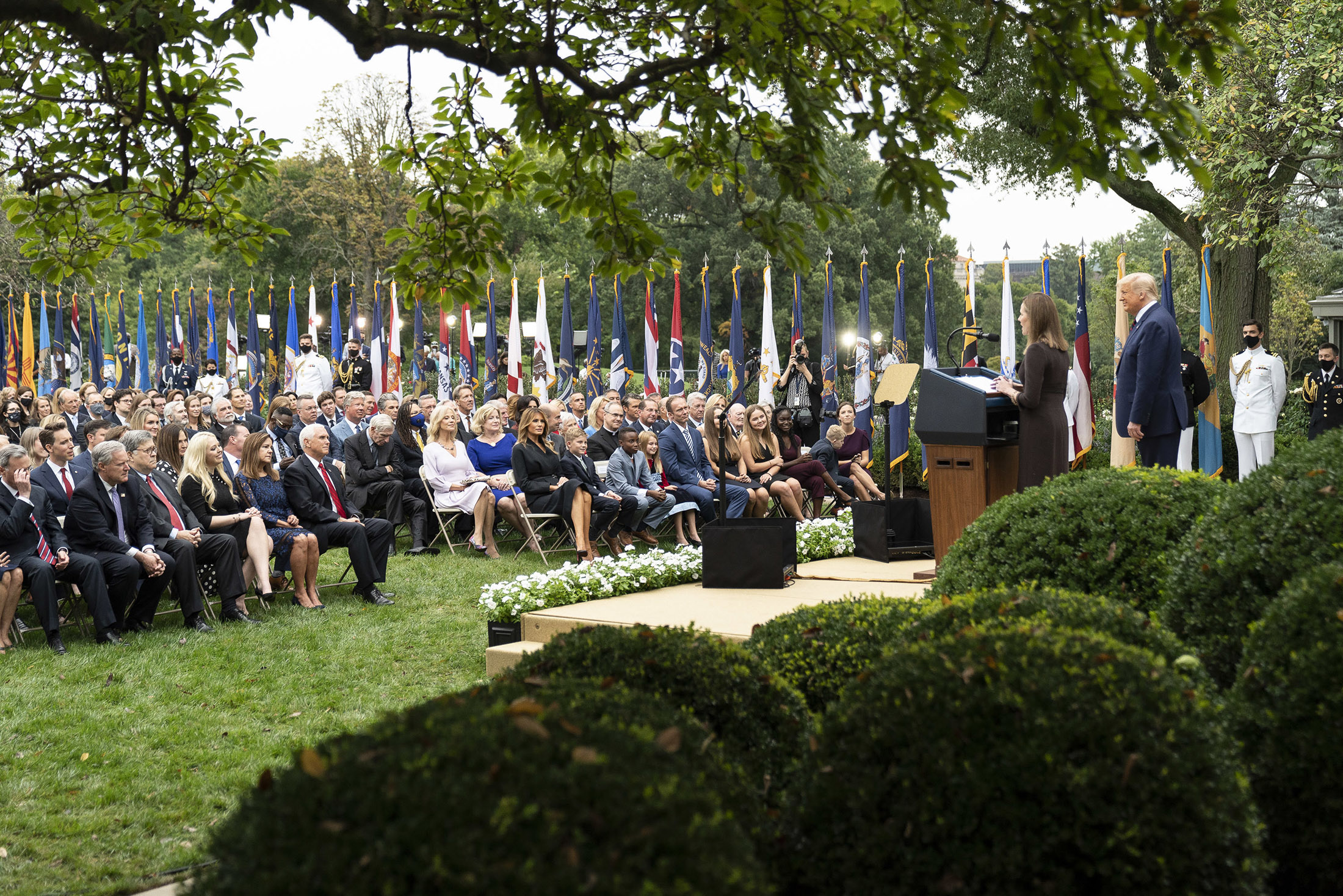 特朗普在白宫玫瑰园举行的仪式上宣布艾米·科尼·巴雷特为他提名的美国最高法院法官,时间是9月26日。活动中有八名与会者后来检测呈阳性,包括总统和第一夫人梅拉尼娅·特朗普,他们可能在一周的社交活动中传播了病毒。