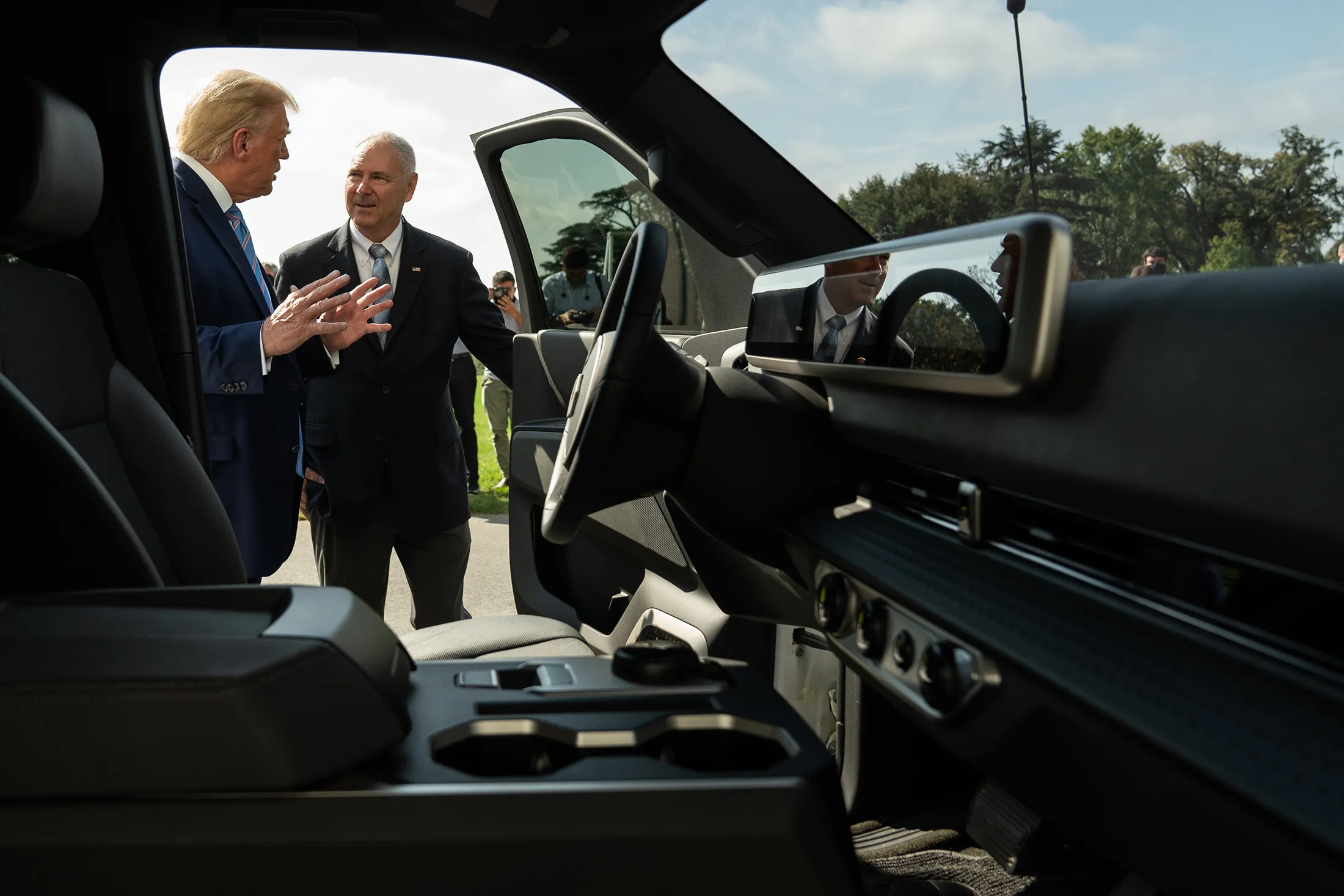 特朗普总统在9月28日白宫南草坪的活动中与洛德斯敦汽车公司首席执行官史蒂夫·伯恩斯交谈。来源:美联社特朗普 退后 以评估停在白宫前的电动卡车,惊叹于每个轮子中电机的布置。“这是世界上唯一一款这样做的卡车,”特朗普说。