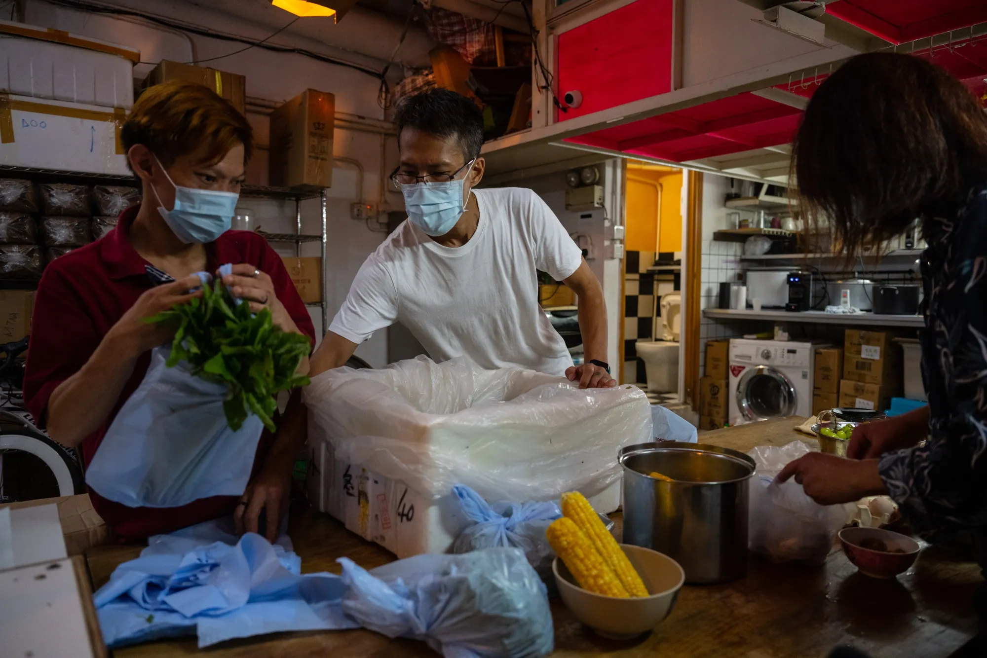 工作人员在ImpactHK的设施“客房”中为有需要的人准备免费餐食。