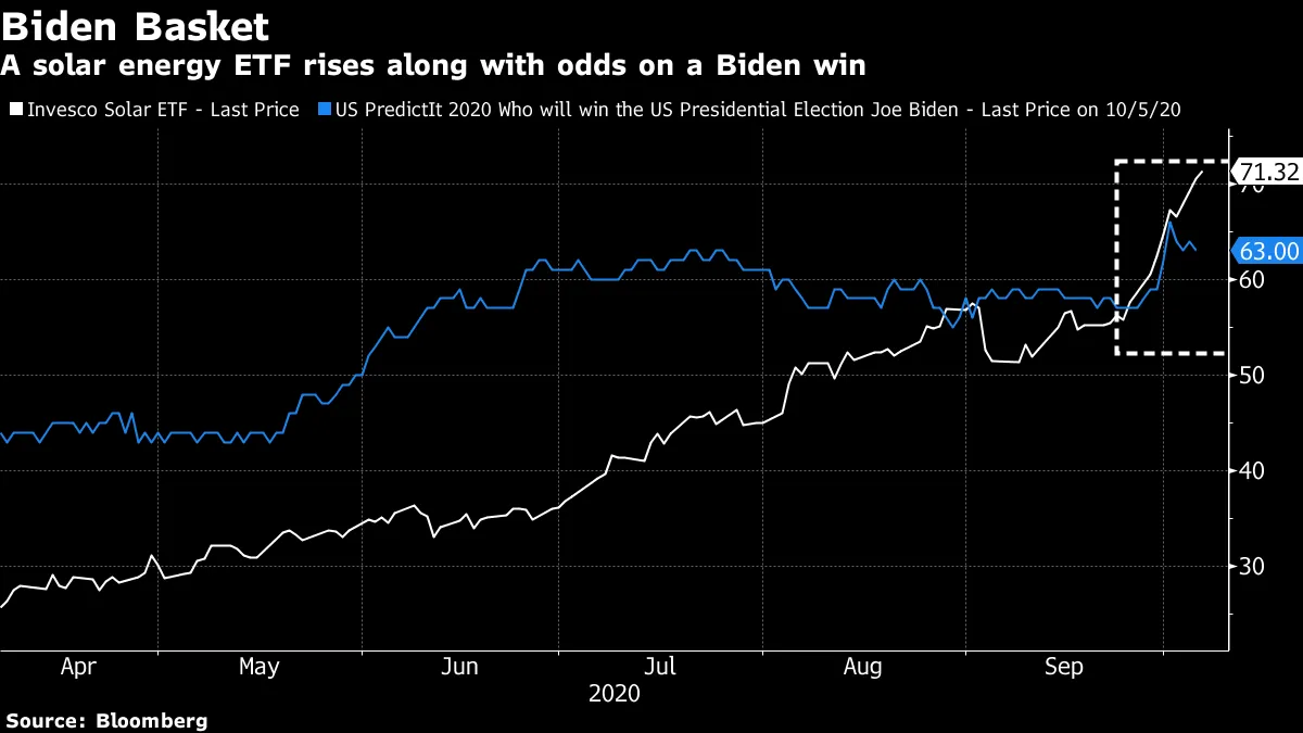 与此同时,分析师们通过观察不同金融资产的篮子来监测市场对拜登和特朗普机会的定价。这些篮子的构成是有信息量的。一方面,“拜登篮子”往往包含可再生能源和基础设施指数,基于民主党将推动刺激和绿色支出的假设。有时它还包括新兴市场货币和海外股票,基于对新政府不会像其前任那样对中国采取强硬措施的预期。