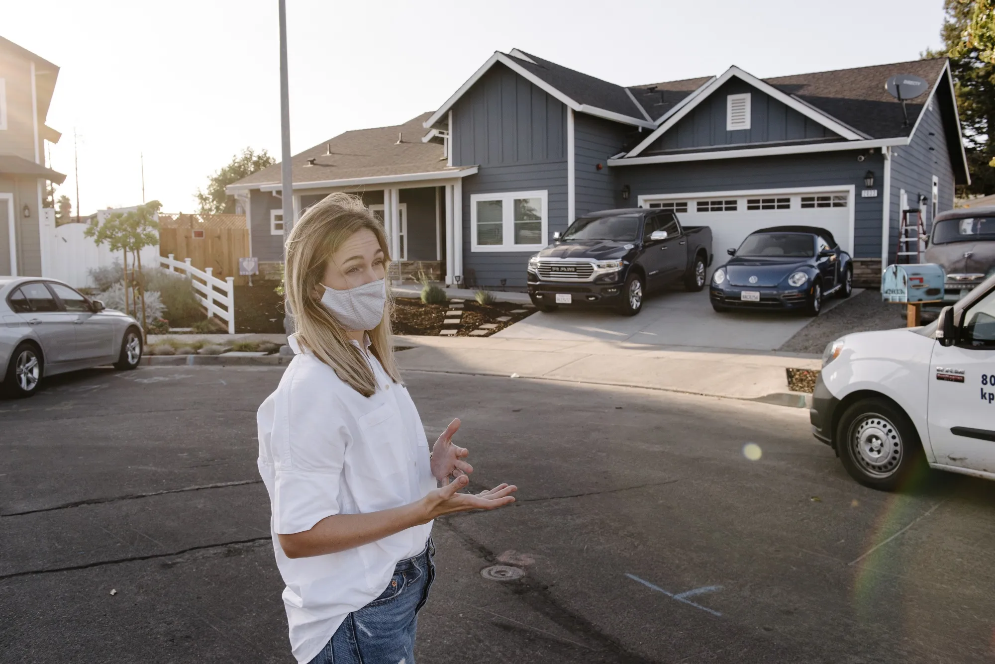 佩切特在圣罗莎的科菲公园社区一栋由Homebound重建的房屋前讨论她的工作。摄影师:迈克尔·肖特/彭博社在最近的九月一个晚上,38岁的佩切特站在圣罗莎科菲公园社区的一条死胡同里,解释她面前Homebound重建的一些定制细节。这位客户是一名餐饮服务商,希望有一个商业厨房,并需要房子能够无障碍,以适应她丈夫最近的中风。科菲公园在三年前几乎被塔布斯火灾完全夷为平地,但现在大部分已重建。几乎没有毁灭的痕迹,但佩切特在解释她的工作时喜欢用大手势,指出草坪上点缀的“科菲坚强” yard signs。