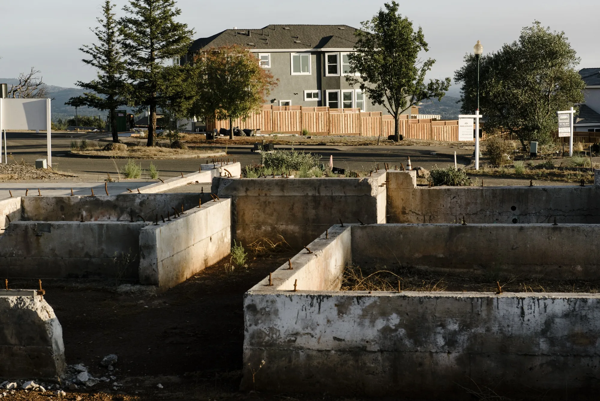 一栋正在由Homebound在圣罗莎的喷泉山社区重建的房屋。摄影师:迈克尔·肖特/彭博社Homebound对谨慎的野火难民的宣传是重建更安全。新建筑符合最新的规范,配备更具韧性的材料和阻挡火灾路径的屏障。此外,烧毁的社区往往像月球表面一样,几乎没有可燃物。