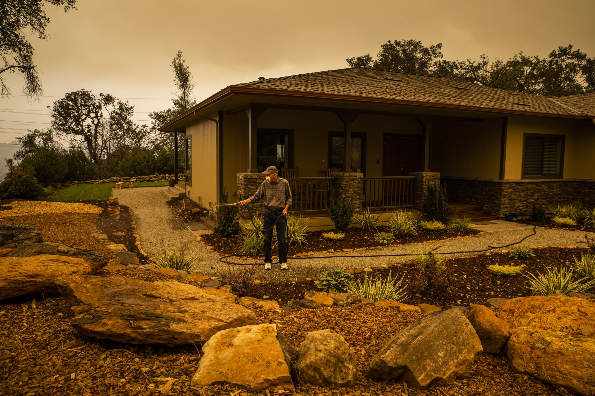 理查德·希克斯在加利福尼亚州圣罗莎的家前洒水,为9月28日的玻璃火灾撤离做准备。