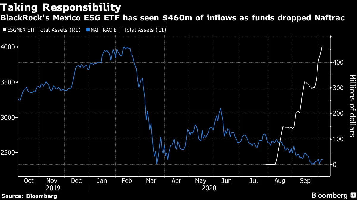 贝莱德公司的iShares ESG MSCI 墨西哥ETF自7月底推出以来,已吸引超过4.6亿美元的资金流入,数据由彭博社汇编。在同一时期,投资者抛售了约3.5亿美元的iShares Naftrac ETF,该ETF一直受到当地养老基金或Afores的青睐,用于押注基准 Mexbol指数。