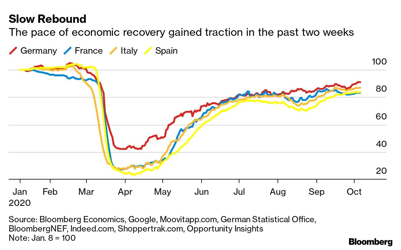 根据彭博经济学的指标,在经历了8月和9月的经济疲软后,过去两周大多数发达经济体的复苏步伐加快,尽管活动仍远低于疫情前的水平,这些指标整合了高频数据,如信用卡使用、旅行和位置信息。德国在复苏中仍处于前沿,但法国、意大利和西班牙的活动也有所增加。