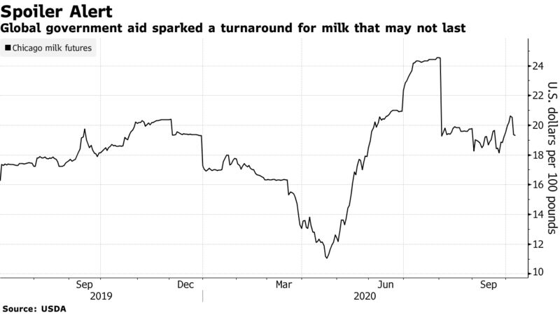 但随后,政府介入并帮助挽救了价格。除了美国的食品计划和奶制品纾困计划外,欧盟和澳大利亚也为该行业拨款。这导致芝加哥的牛奶期货在4月份触及十年低点后飙升。