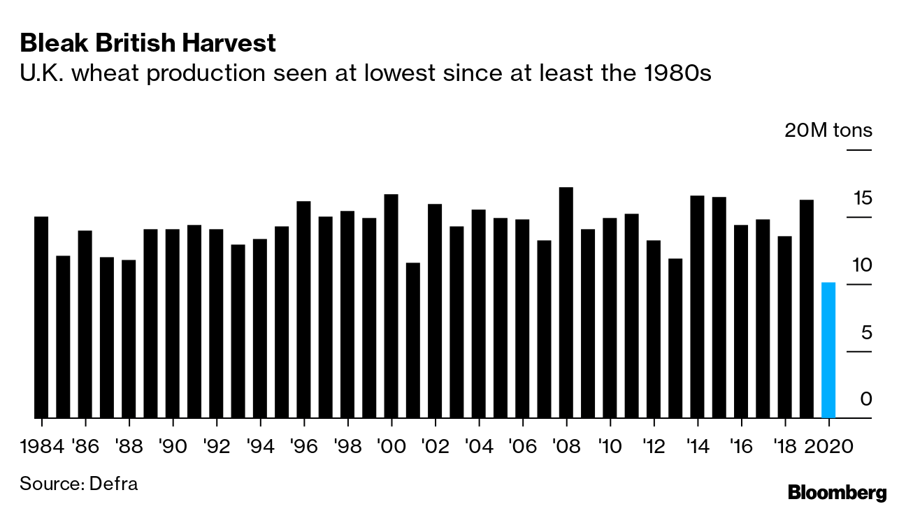 英国至少三十年来收获了最小的小麦产量,在脱欧威胁提高成本或打乱进口流向之际,增加了对进口的依赖。英国农民受到了极端天气季节的打击,创纪录的冬季暴雨削减了春季干旱前的种植量,然后又伤害了幼苗。这意味着小麦收成可能会下降38%,至1010万吨,这是自1984年以来的最低水平,政府估计。