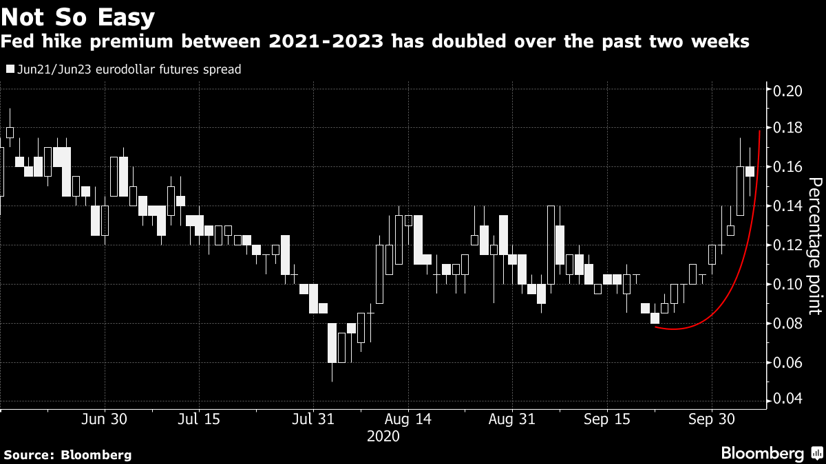 这种指引可能比几周前看起来更为必要。我们的利率记者爱德华·博林布鲁克看到欧元美元市场上出现了更多对美联储“起飞”提前的押注。自9月下旬以来,2021年至2023年之间的加息溢价——由Jun21/Jun23欧元美元期货价差表示——已经从大约8基点翻了一番,达到了约19基点(四分之三的25基点加息)。