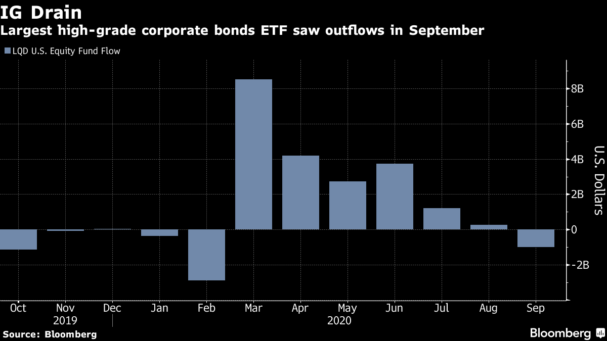 对于许多投资者来说,这并不是新闻,他们对企业信贷的兴趣似乎在过去一个月里有所减弱。自疫情首次扰乱市场以来,投资者在9月份首次从跟踪企业债券的交易所交易基金中撤资。