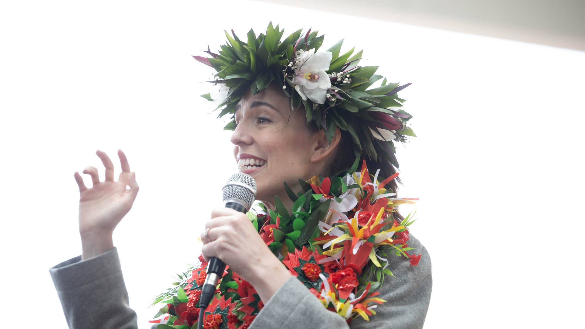 阿德恩在奥克兰的Mangere市场于10月10日举行的竞选活动中戴着太平洋社区送给她的花朵。摄影师:Brendon O’Hagan/Bloomberg