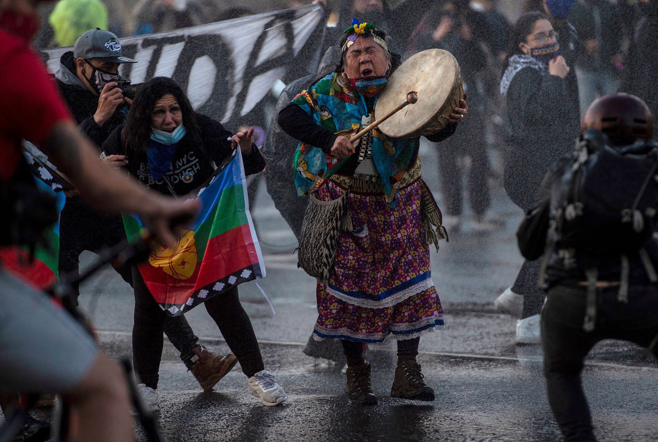 一名马普切妇女在9月4日圣地亚哥击鼓,防暴警察使用水炮驱散示威者。摄影师:马丁·贝尔内蒂/法新社通过盖蒂图片社