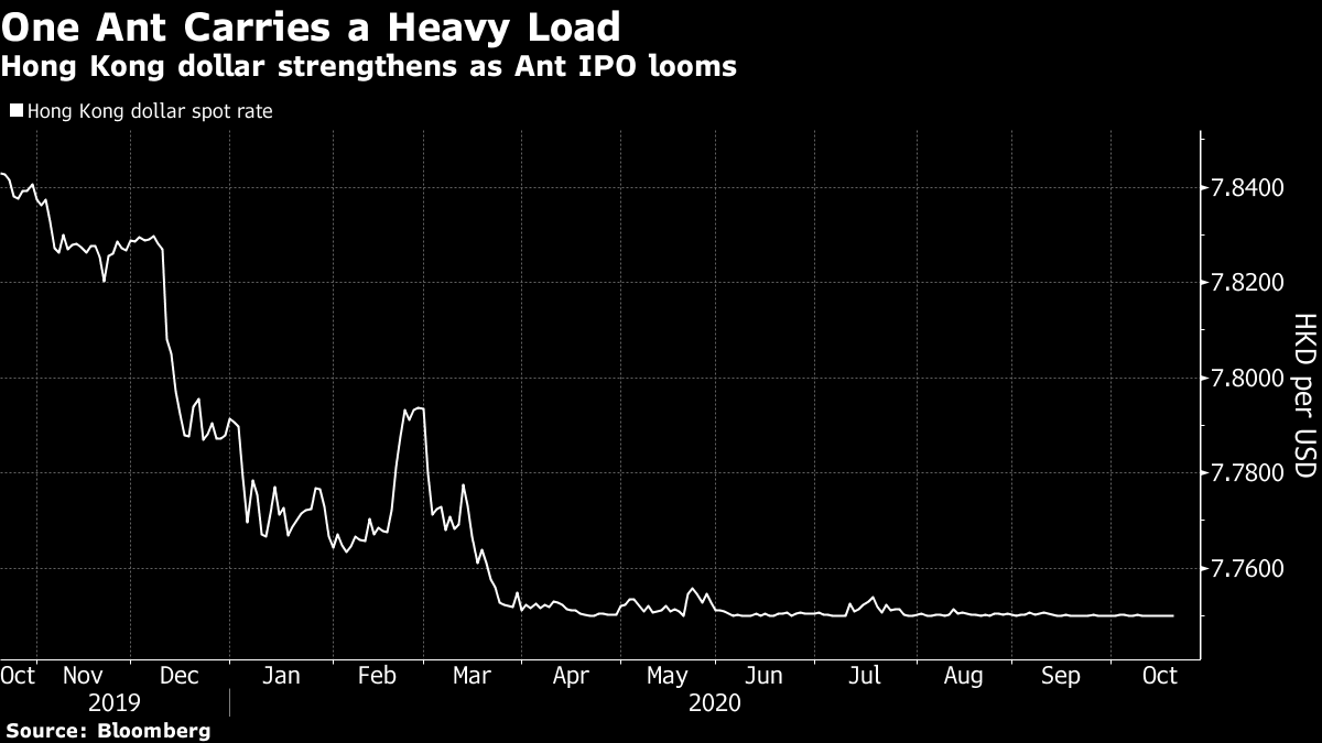 蚂蚁集团,阿里巴巴的金融部门,计划以约2800亿美元的估值筹集约350亿美元,这可能成为有史以来最大的IPO。但这次发行在其他方面也很不寻常。首先,它将在没有基石投资者的情况下进行(蚂蚁认为自己不需要他们)。经纪人向零售投资者提供新发行的蚂蚁股票高达20倍的杠杆(因为它被视为非常确定的投资)。与此同时,正如我的彭博同事今天指出的那样,这次上市的规模之大提振了对港元的整体需求。很少见到一个如此庞大的IPO,以至于成为整个市场的主要吸引力。