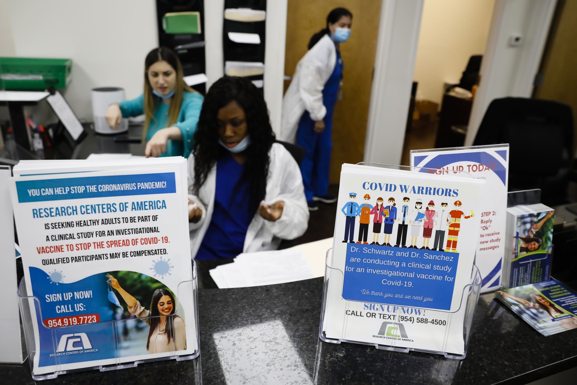 标志要求人们参与在佛罗里达好莱坞的美国研究中心进行新冠疫苗临床试验。摄影师:Eva Marie Uzcategui/彭博社### 您应该阅读的内容