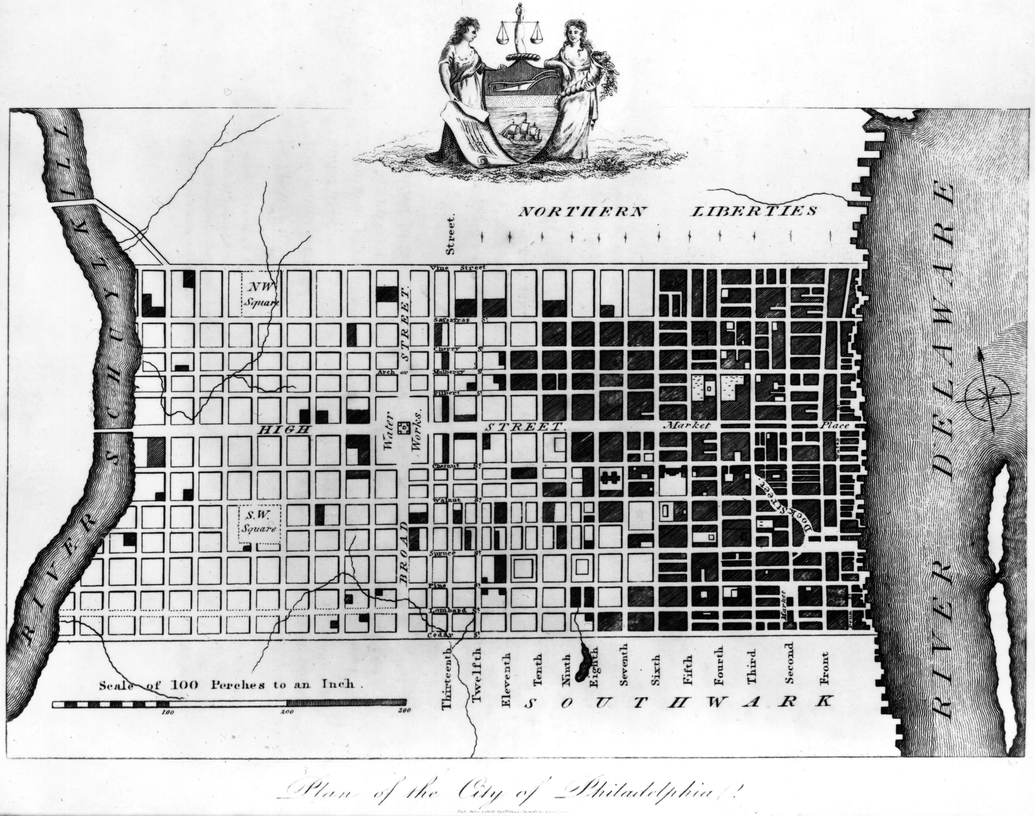 费城市的规划,大约在1750年左右。该城市的网格计划成为北美新城镇和发展的典范,直到20世纪出现了郊区蜿蜒的街道。