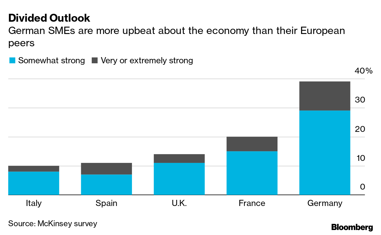 德国的中小企业对本国经济的乐观程度高于欧洲其他地方的同行。德国境内近40%的中小企业表示经济强劲或极其强劲。相比之下,麦肯锡公司在八月对欧洲五个最大经济体的2200多家公司进行的调查显示,只有20%的公司持有这种看法。