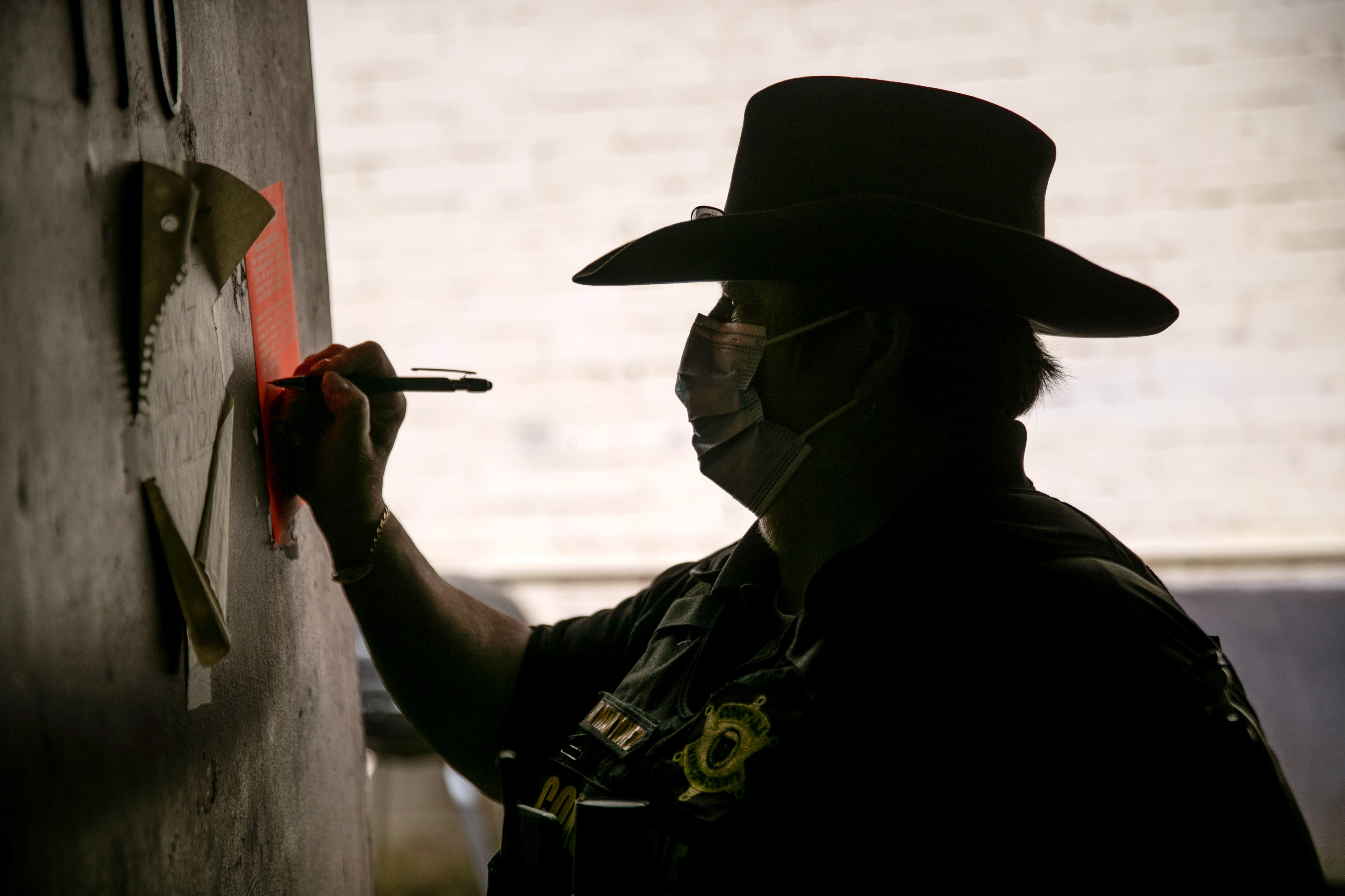 Maricopa County constable Darlene Martinez signs an eviction order in Phoenix, Arizona, in October. Thousands of court-ordered evictions continue nationwide despite a Centers for Disease Control (CDC) moratorium for renters impacted by the coronavirus pandemic. That moratorium is also facing new legal challenges.