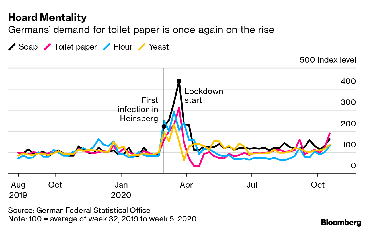 *随着冠状病毒病例再次创下新纪录,德国人对卫生纸的需求再次上升:*上周的销售额比疫情前平均水平高出90%,根据联邦统计局的数据。这些数据表明,随着消费者担心供应短缺和接触限制,囤积行为正在回归。肥皂、面粉和酵母的销售额也大幅上升。