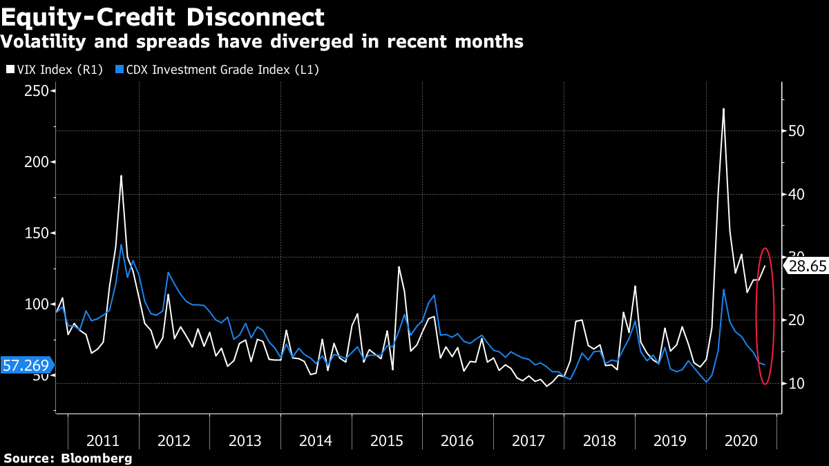 不知不觉距离美国总统选举只有一周半的时间,但从信用市场的情况来看,你几乎感受不到。尽管芝加哥期权交易所波动率指数(股市的“恐惧指数”)仍然维持在相对较高的30水平附近,但企业债券利差一直在稳步回落至疫情前的水平。这导致了VIX指数和投资级利差之间的分歧,它们通常会松散地相互跟踪。