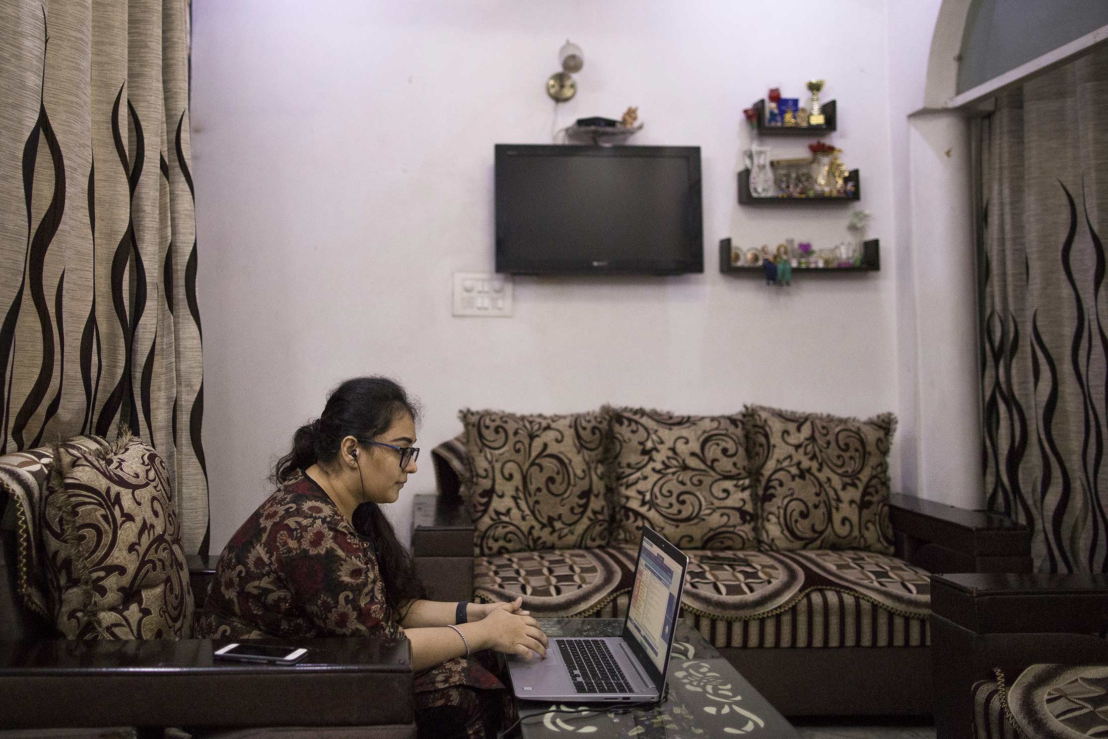 编程老师Jatinder Kaur在她新德里的家里进行在线课程,日期为9月7日。摄影师:Anindito Mukherjee/Bloomberg