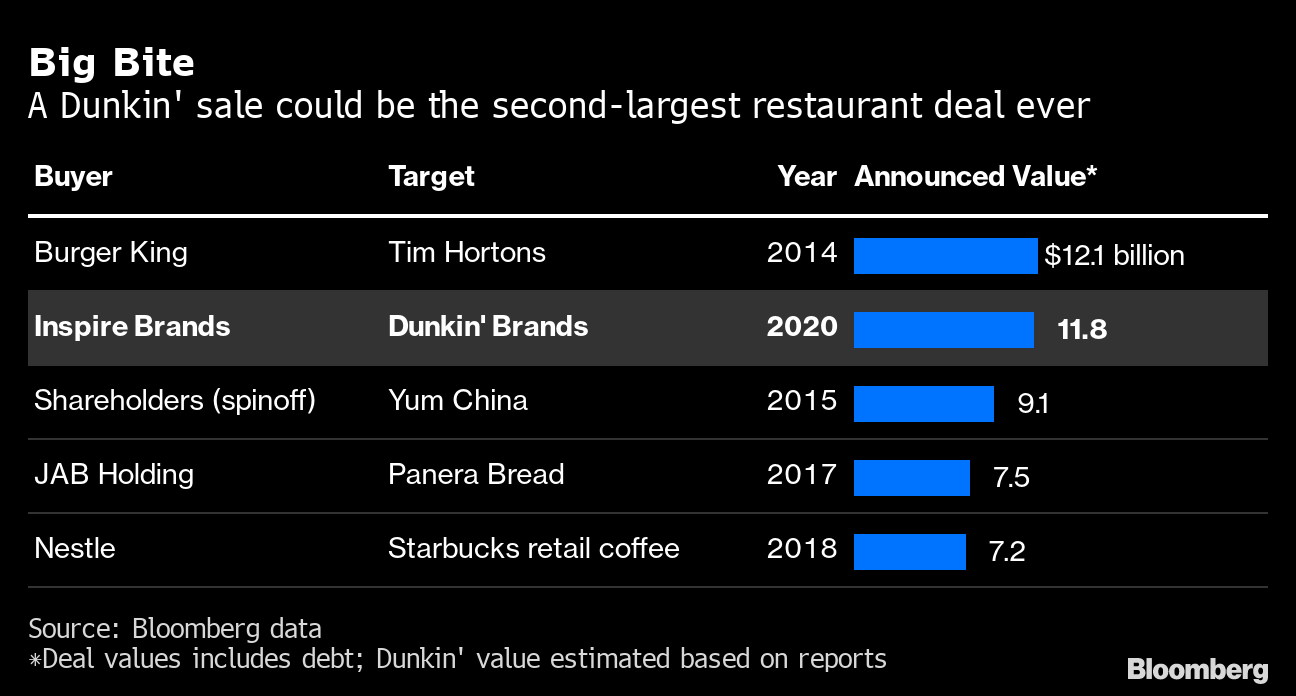 加入一系列收购,私募股权支持的 Inspire Brands 正准备签署餐饮行业有史以来第二大交易,计划以 120 亿美元收购 Dunkin’ Brands。