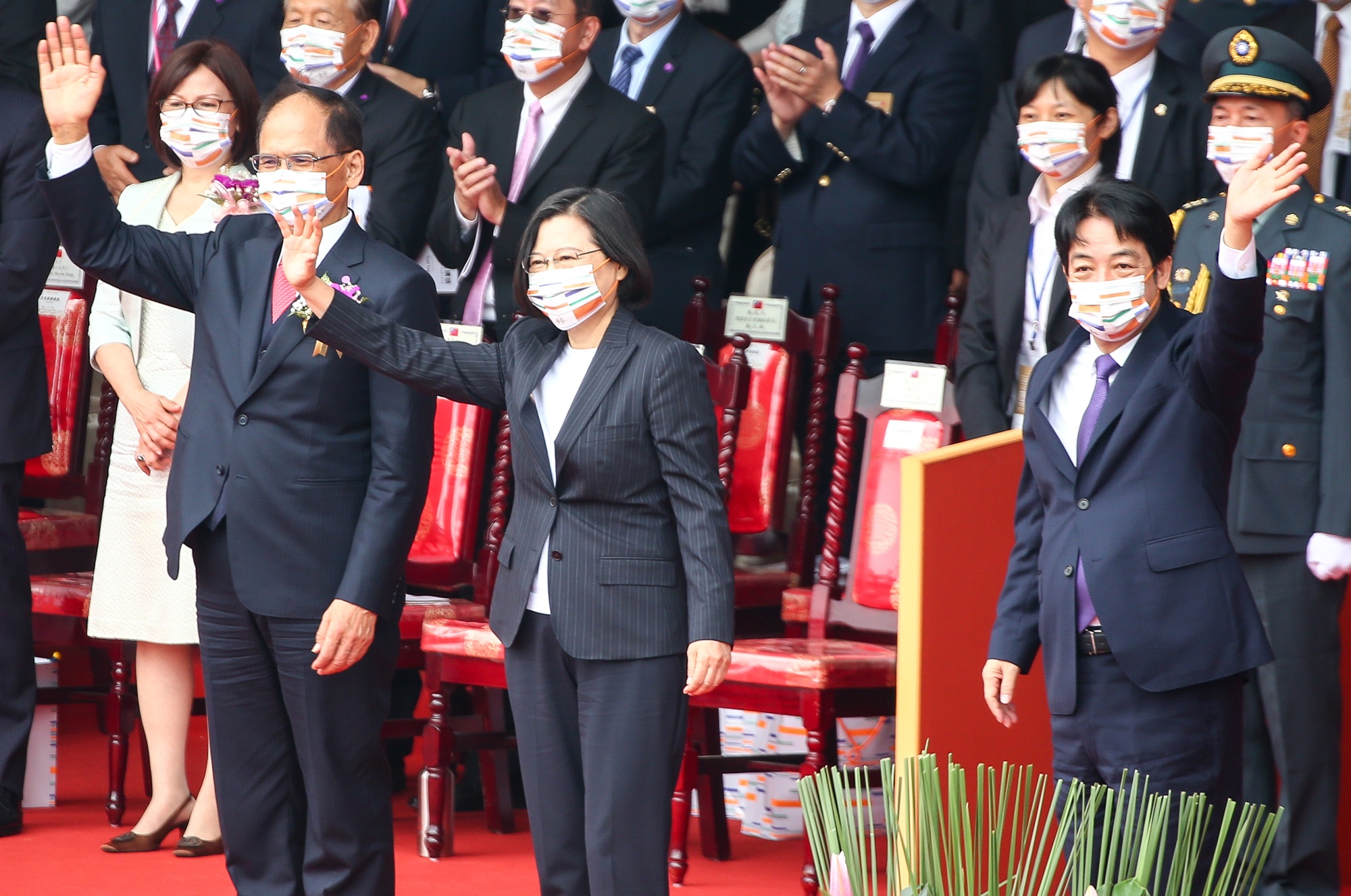 台湾总统蔡英文在10月10日台北举行的国庆庆典上挥手。