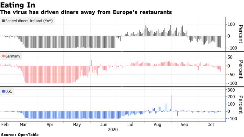 欧洲病例的复苏对餐厅来说是更糟糕的消息,这些餐厅在春季的封锁期间已经关闭了数月。上周,爱尔兰强迫非必要商店、酒吧和餐厅关闭至少六周,周三,德国和法国关闭了酒吧、餐厅和休闲设施一个月。在英国—试图在八月份通过“外出就餐以帮助”计划重振餐厅的—鲍里斯·约翰逊面临被迫违背他的意愿实施全国封锁。