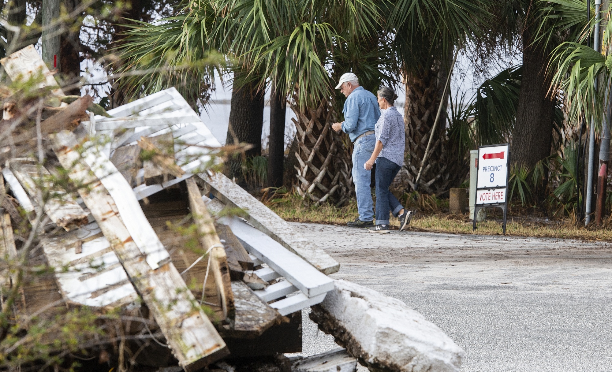 被迫转移的选民穿过残骸前往新的投票地点投票,因为他们常去的投票地点在2018年11月6日被飓风迈克尔摧毁了,地点在佛罗里达州瓦库拉县的壳点海滩。