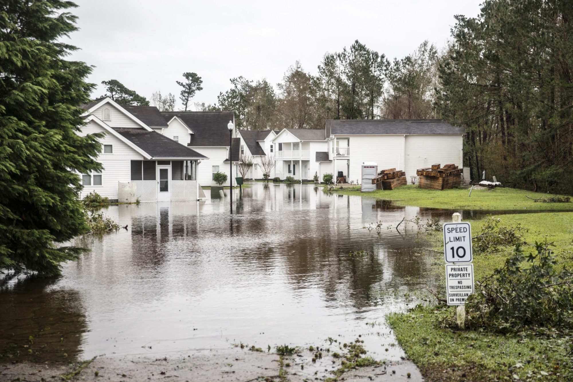 飓风弗洛伦斯袭击北卡罗来纳州威尔明顿后,洪水围绕着房屋。从2010年到2020年,全球极端天气事件造成的损失超过3万亿美元。