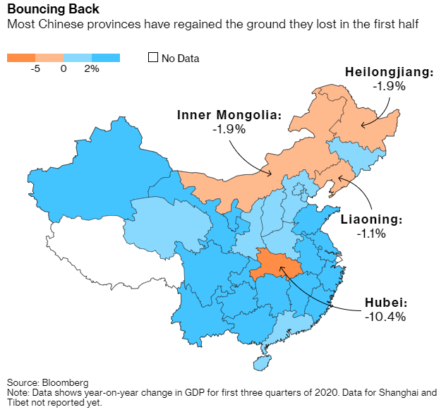 中国从大流行中恢复的速度是世界上最快的,但并不均衡。一些省份迅速复苏,另一些则缓慢,少数省份的经济继续萎缩。然而,有一个地区的情况尤为严重。在2020年前九个月,湖北省的经济比去年同期缩水了10.4%。当然,湖北及其省会武汉是冠状病毒最早出现的地方。它们也是中国受灾最严重的地区,占据了该国感染和死亡病例的大部分。尽管即使在湖北,趋势也是令人鼓舞的。该省的国内生产总值在第二季度较第一季度上升了74%,当时该地区实施了严格的封锁。而与第二季度相比,第三季度上升了11%。即使如此,湖北仍未恢复到疫情前的水平,这说明冠状病毒在2020年初给经济造成了多么严重的打击。