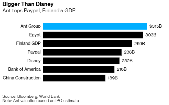 这次首次公开募股不仅筹集了创纪录的345亿美元,还将蚂蚁的估值提升至至少3150亿美元,使其远远超过工商银行的2500亿美元和中国建设银行的1800亿美元。中国最有价值的金融公司现在是由一位名叫马云的前英语教师创立的私营企业。