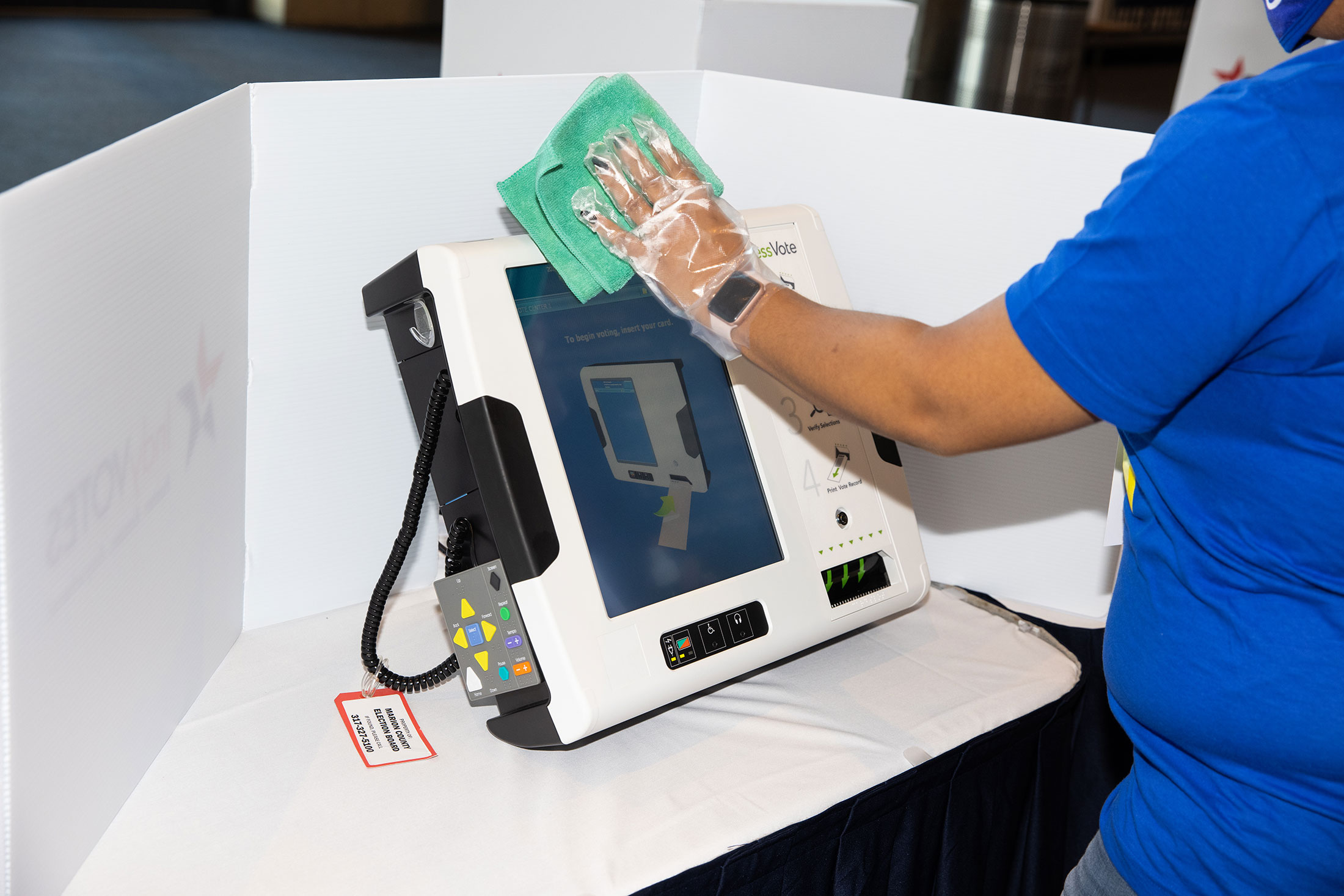 在印第安纳波利斯对投票机进行消毒。摄影师:Jason Bergman